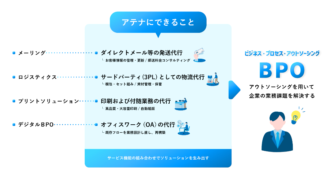 1968年(昭和43年)にダイレクトメールの発送代行会社としてスタートしたアテナ。その後、物流・印刷・コールセンター・データ入力・オフィスワーク・システム開発など幅広い機能を有する総合的BPO企業として成長してきました。
