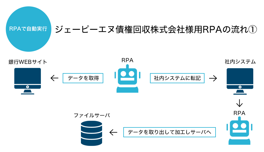 1・銀行のWebサイトから入金データをダウンロードし社内システムに連携して、社内システムでの処理結果を基に加工を行い、所定の場所に格納するロボットになります。