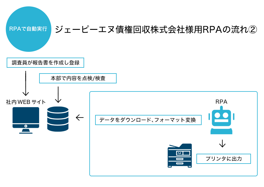 2・現地調査員約150名が日々WEBシステムに報告書を登録しています。その情報をお客様毎(数十か所)に異なるフォーマットに変換し毎朝プリンターで印刷するロボットになります。