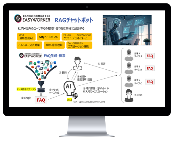 社内の情報から自動生成したFAQを利用して、生成AIがそれらの情報を参照しながら様々な質問に自動応答するチャットボットシステムを構築します。